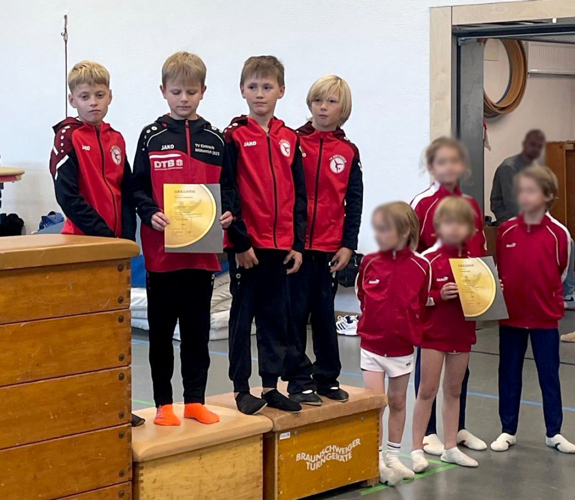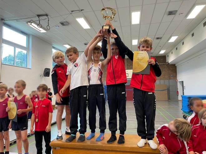Bei den jüngsten Startern bis 9 Jahre gingen Mannschaften aus Porselen, Verlautenheide sowie Mützenich an den Start. In einem spannenden Wettkampf konnte die Mannschaft des TV Mützenich um Levin Binder, Jano Claßen, Enno Kneer, Hannes Lennartz und Luca Richter drei von vier Geräten für sich entscheiden und siegte mit einem souveränen Fünf-Punkte-Vorsprung in der Gesamtwertung vor dem TUS Porselen, der TV Verlautenheide erturnte den dritten Platz.